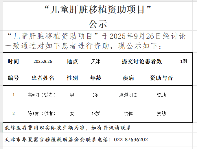 儿童肝脏移植资助项目20250926公示