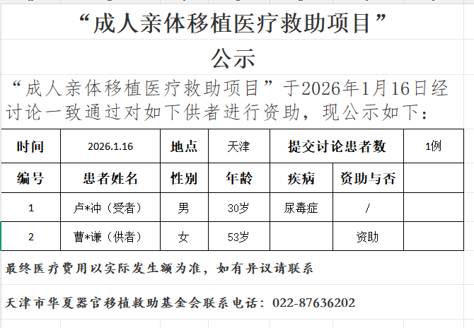 成人亲体移植医疗救助项目20260116公示